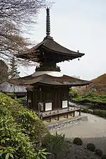 The main image is a statue of thousand-armed Kannon.[3] Notable features include the "Gliding Dragon" pine tree (Yōryu no matsu, a natural monument), which was trained to grow horizontally and was once over 50 meters long,[4][5] and a Tahōtō two-story pagoda (an Important Cultural Asset).[3]