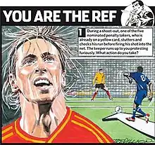You Are The Ref is a British comic strip which has run in various publications since 1957, featuring a series of improbable hypothetical football scenarios that then invites the reader to make the refereeing decision. Created by sports artist Paul Trevillion, also famous for Roy of the Rovers, the strip features contributions from several top referees, and was collected into an official book in 2006.[1] From 2006 to 2016 it featured online on theguardian.com.[2] and in The Observer newspaper.