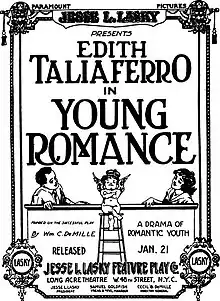 Young Romance is a 1915 American silent romance film directed and produced by George Melford. The film is based on the play of the same name by William C. deMille who also wrote the screenplay. Edith Taliaferro, who made only three films in her career, stars in this film which is the only one of her films that still exists.[1]