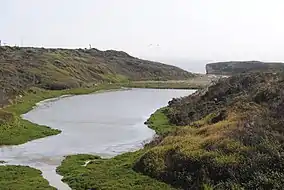 The Y-shaped lagoon is seasonal, filling with winter and spring rains until winter storms erode the sandy berm at its mouth. At this point, the entire lagoon drains over the course of a few hours. Ocean waters fill the lagoon until waves reform the berm, enabling rain and runoff to freshen the waters again.