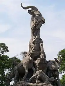 The sculpture represents the five rams who gave Guangzhou its nickname "City of Rams" and were formerly honored at its Temple of the Five Immortals. These immortals were said to have ridden rams into the city soon after its founding, teaching its residents how to grow rice and ending the specter of famine forever. Locals consider the rams symbols of good luck.