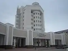 In 2003, a new main building was built for the university. At that time it became the tallest building in Khanty-Mansiysk.[2] In 2007, the university included the following state educational institutions: the Surgut Petroleum Technical School, the Nizhnevartovsk Petroleum Technical School, the Lyantor Petroleum Technical School, and the Nefteyugansk Industrial College. They became branches of the YUSU.[1] In 2013, the university became a center for training the Olympics 2014 volunteers.[3]