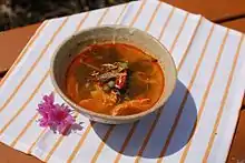 Yukgaejang[1] (육개장, 肉개醬) or spicy beef soup[1] is a spicy, soup-like Korean dish made from shredded beef with scallions and other ingredients, which are simmered together for a long time. It is a variety of gomguk, or thick soup, which was formerly served in Korean royal court cuisine. It is thought to be healthful and is popular due to its hot and spicy nature.[2]
