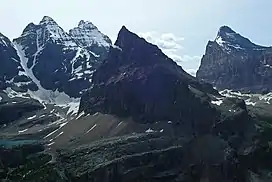 ![]() Yukness Mountain (center) with Ringrose and Hungabee to left and Biddle to right | |
