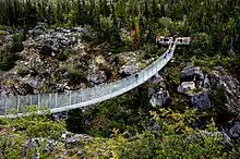 The Yukon Suspension Bridge is a pedestrian cable suspension bridge located on mile 46.5 on the South Klondike Highway in Northern British Columbia, Canada. It is 200 ft (60.96 metres) long and stretches 57 ft (17.36 metres) over the Tutshi River Canyon. There is an admission charge, and it is visited by over 25,000 people every summer between the months of May and September.