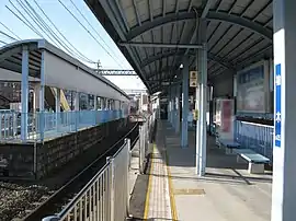 The station has two parallel side platforms. The station building is built onto one end of one of the platforms, and has automated ticket machines, and automated turnstiles, which accept the LuLuCa smart card ticketing system as well as the PiTaPa and ICOCA IC cards.