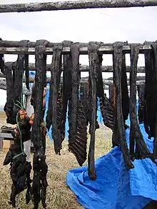 Salmon as food, herring as food, smelt, halibut, flounder, tomcod, pike, and capelin were gutted and air dried or smoked.[4] The fish heads they made into qamiqurrluk (cut and dried fish heads), and some they made into tepa (aged fish heads).[6] Fish eggs (roe) were dried and stored.[4]
