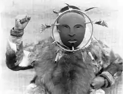 The shaman (angalkuq sg angalkuk dual angalkut pl) played a functional role in dance. The role of shaman as the primary leader, petitioner, and a trans-mediator between the human and non-human spiritual worlds in association with music, dance, and masks. The shaman’s professional responsibility was to enact ancient forms of prayers to request for the survival needs of the people. The specified masks depicted survival essentials requested in ceremonies.[3] Shamans often carved the symbolic masks that were vital to many Yup'ik ceremonial dances and this masks represented spirits that the shaman saw during visions.[4] Nepcetat (powerful ceremonial masks) were empowered by shamans. Shamans wearing masks of bearded seal, moose, wolf, eagle, beaver, fish, and the north wind were accompanied with drums and music.[3]