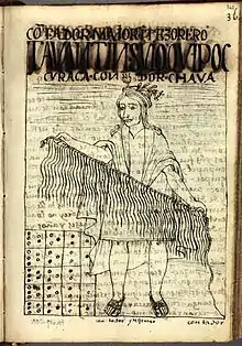 Emilio Mendizabal was the first to propose in 1976 that the Inca a representation based on the progression 1, 2, 3, 5 in addition to the decimal representation.[9] In the same publication, Mendizabal pointed out that the series of numbers 1, 2, 3, and 5, appear in Poma de Ayala's drawing, and are part of the Fibonacci sequence, and stressed the importance of the "magic" that the number 5 contained for civilizations of Northern Peru, similar in significance to the number 8 for the civilizations of Southern Peru.[2]
