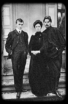 Yuri Zhelyabuzhsky with his mother Maria Andreyeva and Maxim Gorky, 1905
