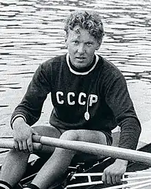 Yury Sergeyevich Tyukalov (Russian: Юрий Серге́евич Тюкалов; 4 July 1930 – 19 February 2018) was a Russian rower. He started primarily as a single sculler; he also won an Olympic gold medal in 1952 and a silver medal at the 1955 European Championships. His Olympic medal was the first Soviet gold medal in rowing.[4] Later in 1955, facing strong competition against the rising star Vyacheslav Ivanov, he teamed with Aleksandr Berkutov. Together they won five consecutive European titles between 1956 and 1961;[5] the Henley Royal Regatta in 1957 and 1958; the Soviet title in 1957 and 1961; an Olympic gold medal in 1956; and an Olympic silver in 1960.[6]