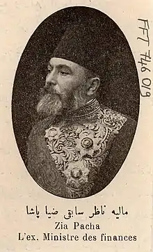 Yusuf Ziya Pasha (1849 – 1929[1]), also known as Youssouf Zia Pacha, was an Ottoman politician and government minister, who was one of the figureheads of the Committee of Union and Progress (CUP). He was the Ottoman ambassador to the United States from June 14, 1910 to 1914.[2]