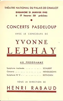 She also performed the German repertoire: Bach, Schumann, Brahms, Beethoven and was the first violinist to play Mendelssohn's Violin Concerto again in public at a concert at the Théâtre National de Chaillot on 21 January 1945 with the Pasdeloup Orchestra conducted by Henri Rabaud, Mendelssohn's music having been prohibited from performance during the occupation by the Nazi regime (see poster opposite).