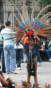 A kid wearing the typical clothing to perform an Aztec Dance in the Zócalo