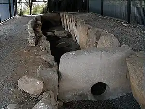 One of the most striking features of the tomb is the presence of carved symbols on the slabs inside the chamber.[8] Lines are formed of rows of individual punched dots, possibly applied with a very early metal tool. One of the more common symbols is a simple line with an attached open semicircle, usually interpreted as a stylised depiction of cattle. Normally, two of these symbols are linked by a further line with emphasised terminals. This may be a simple depiction of a plough. More rarely, two of them are linked by what resembles a yoke and pole, suggesting a cart. Occasionally overlapping signs suggest that the individual carvings are in no meaningful relationship to one another, but represent an accumulation of individual signs. Similar depiction of teams of cattle are known from much more recent (Bronze or Iron Age) carvings at Valcamonica near Capo di Ponte, Northern Italy and at Mont Bégo in the French part of the Ligurian Alps.[9] The symbols are normally assumed to reflect Neolithic ideological or religious ideas.[10]