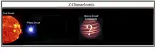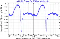 Z Chamaeleontis (abbreviated Z Cha) is a dwarf nova variable star system approximately 377 light-years away from the Sun, where two stars orbit each other every 1.78 hours. The system comprises an eclipsing white dwarf and red dwarf and possibly a yet unconfirmed third low-mass substellar companion.[9]