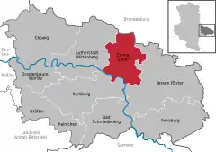 Zahna-Elster is a town in the district of Wittenberg, in Saxony-Anhalt, Germany. It was formed on 1 January 2011 by the merger of the former municipalities Zahna, Dietrichsdorf, Elster (Elbe), Gadegast, Leetza, Listerfehrda, Mühlanger, Zemnick and Zörnigall. On 29 May 2013 the incorporation of Mühlanger was reverted as a result of a decision of the Constitutional court of Saxony-Anhalt,[3] but it was incorporated again on 1 January 2014. These former municipalities are now the 9 Ortschaften (municipal divisions) of the town Zahna-Elster.[4]
