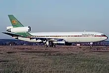 The ATR-42s entered the fleet during the summer of 1988, and came to replace the HS-748s on domestic and regional routes. Later on, one of these brand new ATR-42s was damaged while landing, but nobody was seriously injured.[7] An MD-11 was ordered in 1989 for delivery in January 1992.[20] In March 1990, the chairman position was held by Michael S. Mulenga, and the number of employees was 2,134. At this time, the carrier's network included domestic points along with Bombay (Mumbai), Dar-es-Salaam, Entebbe, Frankfurt, Gaborone, Harare, Jeddah, London, Manzini, Nairobi, New York and Rome. The fleet consisted of two ATR-42-300s, two Boeing 737-200s, one DC-8-71 and one McDonnell Douglas DC-10-30.[21] A Boeing 757 freighter leased from Ansett Worldwide Aviation made Zambia Airways the second non-American carrier, after Ethiopian Airlines, in operating the type.[22]