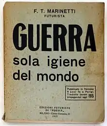 Latter-day admirers of Marinetti tend to see him as an iconoclastic and subversive anti-hero in revolt against an oppressive society, downplaying his role in the founding of Italian Fascism. The Futurist Political Party which Marinetti had founded was absorbed into the National Fascist Party (PNF) of Italy, and he co-wrote with Alceste De Ambris the Fascist Manifesto.[5] "The Doctrine of Fascism" (the PNF's final manifesto) contains a considerable amount of (uncredited) block quotations from The Founding Manifesto of Futurism. Marinetti had organised a punch-up between futurists in Milan, September 1914, to support Italy's entry into the war; in a similar demonstration in May 1915, both he and Benito Mussolini were arrested.[1] The same year Marinetti published the futurist compilation Guerra sola igiene del mondo (War the only world hygiene, 1915)[6] – a polemic to encourage Italy to enter World War I.