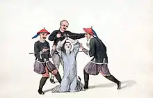 - "Pieces of wood arranged so as to be drawn tight together by strings, and formerly used for squeezing the fingers of prisoners or witnesses in order to extort evidence, but declared under the present dynasty to be illegal" (Giles 1912, 1428)