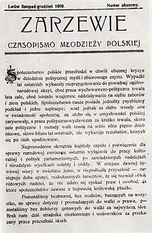 Organisation of Independent Youth Zarzewie was a clandestine Polish youth organization, formed in May 1909 in Lemberg, Austrian Galicia. Based on Association of the Polish Youth "Zet", its objective was the restoration of independent Poland. As part of Polish Military Union (Polski Zwiazek Wojskowy), Zarzewie trained recruits for the future Polish Army.