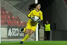As goalkeeper for Rosengård, Mušović played in a match against Chelsea and saved a penalty, keeping the score 2-2, bringing her to the attention of Chelsea coach Emma Hayes.[14] In December 2020, Mušović signed for Chelsea in a two-year deal.[15] She made her debut against West Ham United, keeping a clean sheet in the 2-0 win.[14] In the 2021–22 season, Mušović had the second-highest save percentage of any goalkeeper in the league, only behind Chelsea's first goalkeeper Ann-Katrin Berger. Mušović was the only goalkeeper that season to record an assist.[16] In February 2023, she extended her contract with Chelsea until 2025.[17]