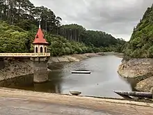 Historically about 60% of the Wellington region was covered with broadleaf forest. Karaka, kohekohe, ngaio and nīkau trees were common but there were also rātā, rewarewa and tawa with occasional podocarps like kahikatea and rimu.[5] The whole sanctuary valley was covered with this sort of forest until European settlement of the area and the large fires in 1850 and 1860 that cleared the land to be used for farming. The lower reservoir, retained by an earth dam, was completed in 1878.[6] Parts of the area continued to be farmed up until 1906 when the remaining catchment was purchased for the water works.[6] The upper reservoir, retained by a concrete gravity arch dam, was completed in 1908.[7] From this point, as the whole valley was a protected water catchment area for Wellington city, the slopes were re-vegetated with introduced trees and the native forest also began regenerating. The upper dam was decommissioned as a reservoir about 1991, the lower one in 1997.[6]