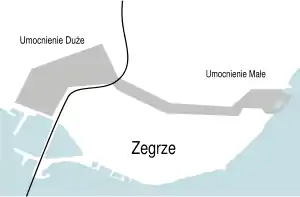 The Zegrze Fortress (Polish: Twierdza Zegrze) is a military structure located in Zegrze, Poland, on a high escarpment over the Narew River. Built in late 19th century by the Russian Empire, it was to guard a river crossing across the Narew. Modernised between 1902 and 1907, it was part of the so-called Warsaw Fortified Area (Russian: Варшавской укрепленной район) comprising three major nodes: the Warsaw Fortress, Modlin Fortress and Zegrze.