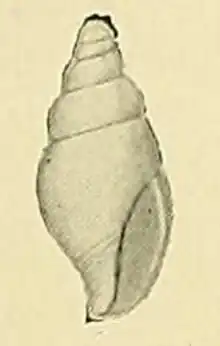 The spire is elevated, conic and about the same height as the aperture. The outlines are almost straight. The protoconch consists of 1½ smooth, porcellanous whorls. The nucleus is a little oblique. The shell contains 5 whorls, regularly increasing and a lightly convex. The body whorl is rounded and contracted at the base. The suture is deep. The aperture is subvertical, high and narrow, lightly channelled above, and with a very short, widely open siphonal canal below. The outer lip is slightly curved, sharp, but little thickened. The columella is vertical, with a deep-seated oblique fold at the base. The inner lip is very narrow and thin, extending over the flattish parietal wall. The operculum is unknown. [2]