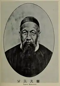 Zeng Guofan, Marquis Yiyong (traditional Chinese: 曾國藩; simplified Chinese: 曾国藩; pinyin: Zēng Guófān; Wade–Giles: Tseng1 Kuo2-fan1;[2] 26 November 1811 – 12 March 1872), birth name Zeng Zicheng, courtesy name Bohan (伯涵), was a Chinese statesman and military general of the late Qing dynasty. He is best known for raising and organizing the Xiang Army to aid the Qing military in suppressing the Taiping Rebellion and restoring the stability of the Qing Empire. Along with other prominent figures such as Zuo Zongtang and Li Hongzhang of his time, Zeng set the scene for the Tongzhi Restoration, an attempt to arrest the decline of the Qing dynasty.[3] Zeng was known for his strategic perception, administrative skill and noble personality on Confucian practice, but also for his ruthlessness in repressing rebellions.
