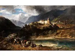 Mid-19th century painting by Carl Ebert (1821–1885), Fortress Vranduk in Bosnia (German: Die Festung Vranduk in Bosnien). The picture shows Bosnians on the mountain of Vranduk, beside the Bosna river)
