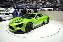 The Zenvo ST1 is a high performance sports car. Its Twincharged 7,011 cc (7.0 L; 427.8 cu in) LS7 V8 engine[2] generates 1,104 PS (1,089 bhp; 812 kW) at 6,900 rpm and 1,430 N⋅m (1,055 lb⋅ft) of torque at 4,500 rpm.[3] According to The Motor Report, the car set a 0–100 km/h (62 mph) time of 3.0 seconds, with 0–200 km/h (124 mph) taking 8.9 seconds, and a top speed of 375 km/h (233 mph).[4]