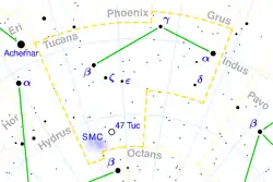 Zeta Tucanae, Latinized from ζ Tucanae, is a star in the constellation Tucana. It is a spectral class F9.5 main sequence star with an apparent magnitude of +4.23. Despite having a slightly lower mass, this star is more luminous than the Sun.[7] Based upon parallax measurements by the Hipparcos spacecraft, it is approximately 28.0 light years from Earth.[1] This is one of the least variable stars observed during the Hipparcos mission.[4][15]
