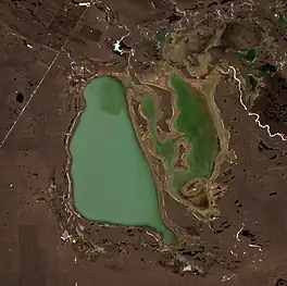 Zhalauly is an endorheic lake lying at the southern end of the Ishim Plain. It consists of a larger western lake and a smaller eastern one, connected at the northern end by a sound. There are small salt flats and salt marshes to the northeast.[7] The lakeshores are dissected and largely swampy. The lake freezes in early November and thaws in late April.[1][5]