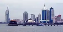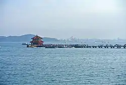 Zhanqiao (traditional Chinese: 棧橋; simplified Chinese: 栈桥; lit. 'loading pier') pier is located at the southern shore of Qingdao, China, off Zhongshan Road. This now 440-meter-long (1,443.6 ft) pier, constructed in 1891, was Qingdao's first wharf. The octagonal Hunian pavilion (Billowing Back and Forth Tower, loosely translated) was constructed at the end of the pier in 1930, and features as the logo of Tsingtao Brewery.[1][2]