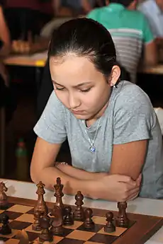 During 2013, Abdumalik crossed ratings of 2200 and 2300 for the first time.[11] She entered the Kazakhstani women's national championship and finished runner-up to Guliskhan Nakhbayeva, who won on the tiebreak criteria after they both scored 7/9.[6][24] She also entered the open section of the under-20 junior national championship and won both the rapid and blitz events.[6][25][26] Later in the year, Abdumalik had a breakthrough at the World Junior Championships in Turkey. She won the silver medal as a 13-year-old with a score of 9½/13, a point behind only Aleksandra Goryachkina, one of the two players she lost to in the event. Among the players Abdumalik defeated in the event was Deysi Cori, a WGM rated 2433.[27][28][29] With this achievement, she earned her second WGM norm and was later named the Best Girl Under-20 at the 1st Annual Asian Chess Excellence Awards.[22][30] Late in the year, Abudmalik had another big achievement, winning the Brno Open in the Czech Republic as the sixth-highest rated player in the event. She scored 7½/9, a full point ahead of the two highest-rated players, Toms Kantāns and Vojtěch Plát, who came in joint second with several others.[31][32] Abdumalik began 2014 by achieving her final WGM norm at the Gibraltar Chess Festival in February. She scored 5½/10 against opponents with an average rating of 2366, notably defeating Felipe El Debs, a GM rated 2520.[33] As she had already reached the 2300 rating threshold, she earned the WGM title less than a month after turning 14 years old.[22] She had another successful result in speed chess later in the year, winning the bronze medal in 2014 Asian Women's Blitz Championship behind gold medallist Tan Zhongyi and silver medallist Dronavalli Harika.[34] Her career-best rating during the year was 2379.[11]