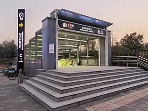 Zhengzhou University Sci-Tech Park (Chinese: 郑大科技园) is a station of Phase II of Line 1, Zhengzhou Metro. The station started construction in February 2014 and was put into service at January 2017[1] with the beginning of trial operation of Phase II. This station lies beneath the crossing of Changchun Road (长椿路) and Cuizhu Street (翠竹街), outside the east gate of Zhengzhou University (new campus).