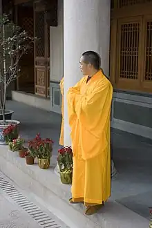 A Chinese Buddhist monk wearing a yellow haiqing.