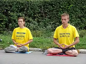 The term practice refers to the five exercises, one of which is a sitting meditation. In the book Falun Gong, Li Hongzhi describes the principles behind the exercises.[40]