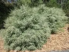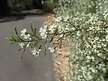 The flowers are white and are arranged in upper leaf axils, usually in groups of five to eight, but sometimes as many as 27. The groups are usually shorter than the leaves. There are four more or less hairy, triangular sepal lobes less than 1.0 mm (0.04 in) long. The four petals are about 2.5 mm (0.1 in) long and slightly hairy. In common with other zierias, there are only four stamens. Flowering occurs from May to September and is followed by the fruit which is a yellow-brown, egg-shaped capsule containing one black seed.[1][2][3]
