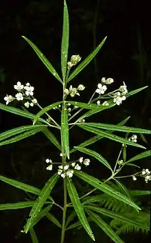 The flowers are arranged in clusters which are shorter than the leaves, each flower on a stalk 5–8 mm (0.2–0.3 in) long. There are one or two bracts 8–12 mm (0.3–0.5 in) long at the base of the cluster, but the bracts fall off early in the flowering period. The sepal lobes are triangular, 2–3 mm (0.08–0.1 in) long and hairy. The four petals are 4–5 mm (0.16–0.20 in) long and covered with short, soft hairs and there are four stamens. Flowering occurs from late August to September.[2][3]