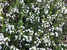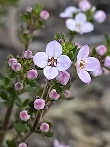 The flowers are arranged singly or in groups of up to three in leaf axils, the groups usually much longer than the leaves. The sepals are triangular, about 1.4 mm (0.06 in) long and hairy. The four petals are white to pale pink, 4–6 mm (0.16–0.24 in) long, overlap at their edges and are covered with tiny, soft hairs. Flowering occurs from late winter to summer and the fruits which follow are hairy and dotted with oil glands.[3][4][5]