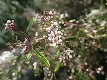 Zieria collina is a spreading shrub with velvety hairs and which grows to a height of 3 m (10 ft). The leaves are arranged in opposite pairs and are composed of elliptic to lance-shaped leaflets 12–20 mm (0.5–0.8 in) long and 3–5 mm (0.1–0.2 in) wide. The upper surface of the leaflets is a darker shade of green than the lower surface and usually has a few hairs and tubercles while the lower surface in densely covered with velvety hairs. The leaf stalk is 1–8 mm (0.04–0.3 in) long. The flowers are bright white, about 7 mm (0.3 in) in diameter and are arranged in groups of 15 to 30 in leaf axils and the groups are usually longer than the leaves. The sepal have four lobes and there are four petals. In common with other zierias, there are only four stamens. Flowering mainly occurs from August to October but flowers are often seen at other times. Fruit opens about six weeks after flowering.[2][3]