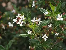 The flowers are white to pale pink and are arranged in groups of mostly six flowers (but sometimes as few as one or as many as 35) in leaf axils. The groups are usually about as long as the leaves. The four sepal lobes are about 1.5–2.5 mm (0.06–0.1 in) long and hairy on the outside. The four petals are 2–2.5 mm (0.08–0.1 in) long and in common with other zierias, there are only four stamens. Flowering occurs in spring and is followed by fruit which is a glabrous follicle composed of up to four sections joined at the base and which burst open to release their seeds when ripe.[2][3]