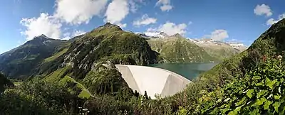 The Zillergründl Dam is an arch dam on the Ziller River in the upper Ziller Valley of Tyrol state, Austria. It is 16 km (10 mi) east of Mayrhofen. The primary purpose of the dam is hydroelectric power production and it supports a 360 MW pumped-storage power station. As part of the Zemm-Ziller Development, construction on the dam began in 1981 and it along with the Häusling Pumped Storage Power Plant were complete in 1986. The power plant was fully commissioned by 1988. The dam is the second tallest in Austria.[3]