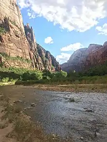 The beginning of the canyon is usually delineated as the Temple of Sinawava, a vertical-walled natural amphitheater nearly 3,000 feet (910 m) deep. The canyon begins much further upstream, however, and runs southward about 16 miles (26 km) through the Narrows to reach the Temple, where a seasonal tributary of the North Fork plunges over a tall waterfall during spring runoff and after heavy rain. The gorge then runs southwest through the national park, approaching 2,000 feet (610 m) deep in places. While the canyon rim is dominated by desert, the canyon floor supports a forest and riparian zone watered by the North Fork Virgin River. The gorge then merges with Pine Creek Canyon as it winds out of the national park and past the community of Springdale, Utah. The canyon's end is where it meets the Virgin River; some 100 miles (160 km) northeast of Lake Mead, into which the river ultimately flows.[2][3]