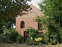 The chapel is a small and simple but "striking red and grey brick building".[9][10] The street-facing façade has two round-arched windows and a gabled entrance porch inscribed with the year 1834. Above this is a pediment, flush with the façade, whose tympanum has an oculus-style recess.[9][12] A distinctive feature of the pediment is its use of alternate grey and red bricks laid in Flemish bond formation; the stretcher bricks (those with the long face showing) are red and the header bricks (whose short side is showing) are red, producing a regular pattern. The other walls are solely of red brick.[13]