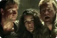 Tony DiNozzo (left) and Timothy McGee (right) rescue Ziva David (center) in the seventh season premiere