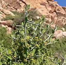 The leaves are deciduous and are absent for much of the year, leaving the shrub a naked thicket of gray twigs coated in waxy whitish hairs. The ends of the twigs taper into sharp-tipped thorns. The thick, glandular gray or green leaves have oval blades 1 or 2 centimeters long.