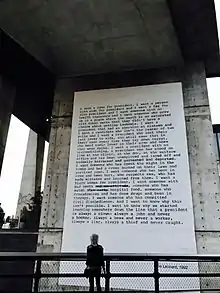 More recent exhibitions have included You See I Am Here After All at Dia: Beacon (2009) which featured a set of 3883 postcards of waterfalls, reminiscent of Yokoo Tadanori's Waterfall Rapture collection of 13,000 waterfall postcards,[18] one of which carries the phrase "You See I Am Here After All" which critic Jonathan Flatley connects to the work of On Kawara's telegrams which read "I AM STILL ALIVE"[19] This work was also exhibited at the Whitney in Leonard's 2018 retrospective.[20] Other exhibitions such as Serialities at Hauser & Wirth, Observation Point Archived 2014-01-02 at the Wayback Machine, Camden Arts Centre, London (2012), an installation at the Chinati Foundation, Marfa, Texas (2013-2014) and the 2014 Whitney Biennial, for which Leonard won the Bucksbaum Award with her work "945 Madison Avenue". In 2018, the Whitney Museum of American Art mounted Leonard's first career retrospective in the United States, an exhibition organized by the Museum of Contemporary Art, Los Angeles, where the show traveled in late 2018.[21][22]